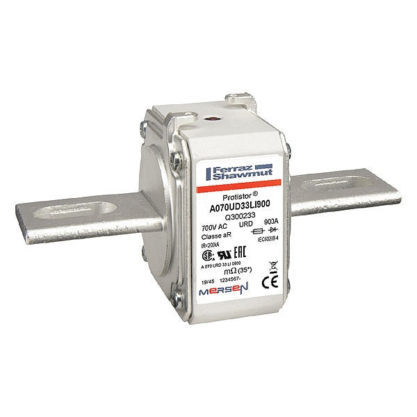 SKU G3228709CategoriesDescription Semiconductor Fuse, 900 A, 700V AC, Not Rated, A070 Series, Indicating, Fast Acting, Body Style Square, Nonrejection, Interrupt Rating 200kA at 700V AC, Fuse Size 6 in L x 2-15/16 in W x 2-15/16 in D, Length 6 in, Width 2-15/16 in, Depth 2-15/16 in, Diameter Not Applicable, Equivalent Brand and Series Bussmann FWP, Littelfuse L70S, Mersen A070, Equivalent Series A070, FWP, L70S, Body Material Ceramic, Single ElementgraingerSKU: , mscSKU: , zoro_no: G3228709, mongo_id: 65bbe9fd22d7a989a998b4e5