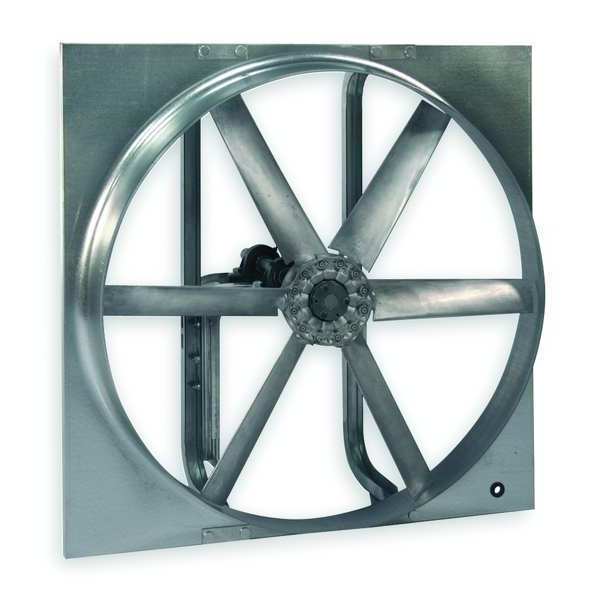 Description Exhaust/Supply Fan, Assembled Unassembled, Blade Diameter 48 in, Blade Material Aluminum, Drive Type Belt Drive, Exhaust Airflow @ 0.000 in SP 35,694 cfm, For Cut-Out Height 50 1/2 in, For Cut-Out Width 50 1/2 in, Frame Finish Zinc Plated, Frame Material Steel, Guard Type None, Includes Drive Package, Includes Dehumidistat No, Maximum Airflow 35,694 cfm, Maximum Noise Level 61 sones