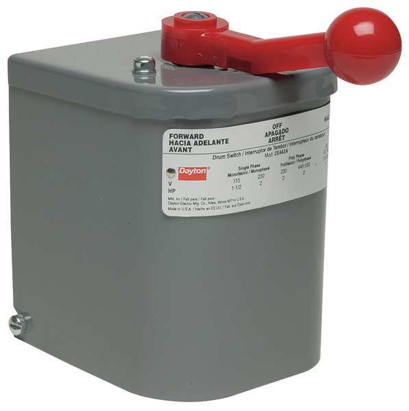 SKU G1515972CategoriesDescription Drum Switch, Switch Action Maintained, Phase Single, Reversing Capability Reversing, Horsepower @ Three Phase - 240V AC 2 hp, Horsepower @ Three Phase - 480V AC 2 hp, Mounting Style Flange, Horsepower @ Single Phase - 120V AC 1 1/2 hp, NEMA Enclosure Rating 1, Number of Poles 3, Horsepower @ Single Phase - 240V AC 2 hp, Contact Material Copper, Resistance Properties Corrosion Resistant, Overall Width 3.5 in, NEMA Enclosure Material Steel, Overall Depth 5 in, Overall Height 5.5 ingraingerSKU: 2X442, mscSKU: , zoro_no: G1515972, mongo_id: 65bbe99f22d7a989a99699e9