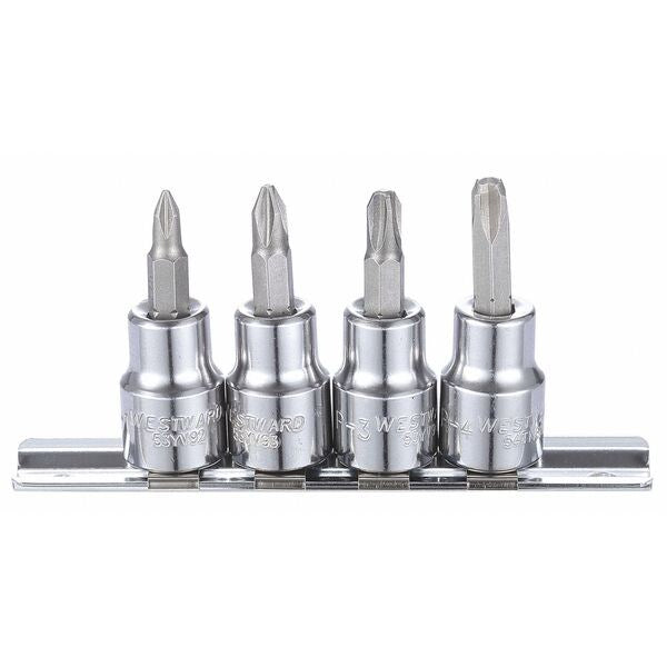 SKU G3374073CategoriesDescription Socket Bit Set, Tip Size #1, #2, #3, #4, Tip Style Phillips, Overall Length 1 27/32 in, Drive Size 3/8 in, Number of Pieces 4, Alloy Steel, Chrome, SAE, Insulated No, For Screw Type PhillipsgraingerSKU: 54TN84, mscSKU: , zoro_no: G3374073, mongo_id: 65bbe8819a749db822796841