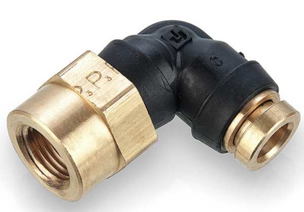 Description Swivel Elbow, Application Air, Fitting Side A Connection Type Push-to-Connect, Fitting Side B Connection Type FNPT, Fitting Side A Pipe Size 1/4 in, Fitting Side B Pipe Size 1/4 in, Fitting Side A Tube Outer Diameter 3/8 in, Fitting Side B Tube Outer Diameter 3/8 in, Fitting Material Brass, Fitting Thread Size 1/4-18, Material Grade C36000, Color Black, Includes Pre-Applied Thread Sealant No, Maximum Operating Pressure 250 psi, Maximum Operating Temperature 200 Degrees F