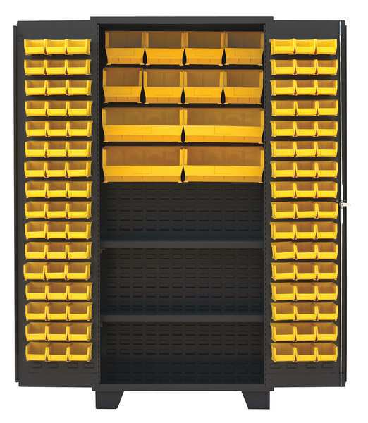 Extra-Heavy Duty Bin Cabinet, 36 in W, 78 in H, 24" D, 112 BinsSKU G9945695CategoriesDescription Bin Cabinet, Base Type Legs, Bin Color Yellow, Bin HxWxD (16) 7 in x 8 1/4 in x 11 in, (96) 3 in x 4 1/8 in x 7 1/2 in, Cabinet Color Black, Cabinet Storage Components Bins, Shelves, Door Type Flush, Frame Assembled Assembled, Mobility Stationary, Number of Bins 112, Number of Cabinet Bins 16, Number of Door Bins 96, Number of Shelves 2, Overall Depth 24 in, Overall Height 78 in, Overall Width 36 in, Vertical Shelf Clearance (2) 2 1/2 in, Bin Depth 7 1/2 in, 11 in, Bin Height 3 in, 7 ingraingerSKU: 18H147, mscSKU: , zoro_no: G9945695, mongo_id: 65bbe80f9a749db82276ef7c