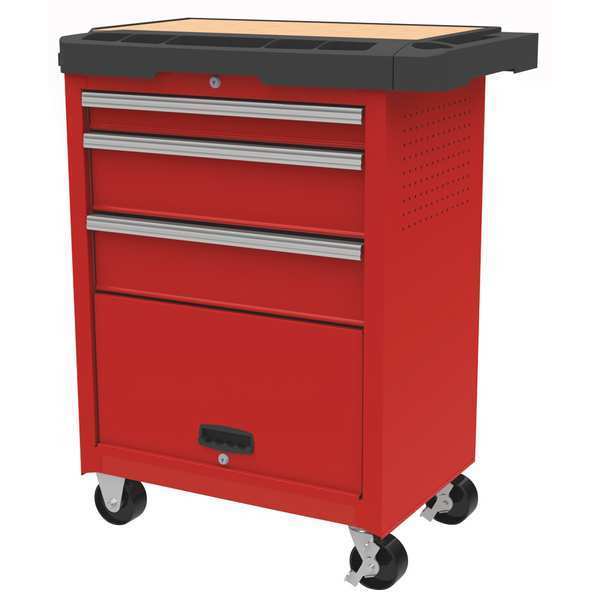 Description Rolling Tool Cabinet, Standard Duty, Width 34 5/16 in, Depth 19 1/2 in, Height 39 5/16 in, Number of Drawers 3, Red, Drawer Color Red, Drawer Capacity 66 lb, Ball Bearing, Full Extension Drawer Slides, Powder Coated Finish, Storage Capacity 10,813 cu in, Load Rating 660 lb, Caster Size 4 in x 2 in, Number of Shelves 0, Steel, Body: 21, Drawer: 24 Gauge, Work Surface Material MDF, PP, Caster Wheel Material Polypropylene, Caster Type Solid, Keyed