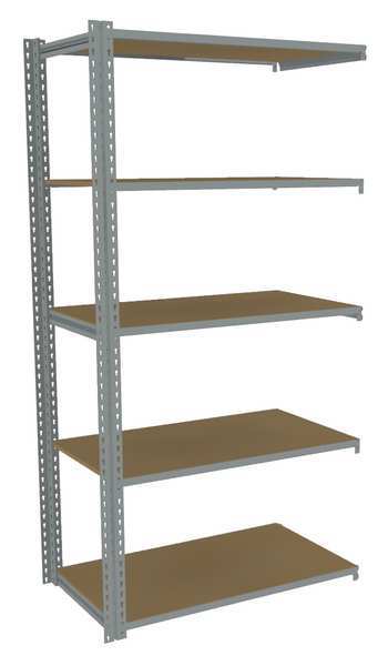 $417.49 / eachWeb priceBoltless Shelving, 30-5/8"D x 43"W x 84"H, 5 Shelves, Carbon SteelSKU G2003552Categories Raw MaterialsDescription Boltless Shelving, Low Profile, Overall Depth 30 in, Overall Height 84 in, Overall Width 42 in, Shelf Gauge 14 ga, Shelf Adjustment Increments 1 1/2 in, Steel, Particleboard, Steel, (2) Posts, (20) Beams, Includes Decking Yes, 550 lb, Whole Unit Load Capacity 2,750 lb, Add-On, Open, Post Gauge 16 ga, Number of Shelves 5, Maximum Post Load Capacity 8,000 lb with Beams Evenly Spaced at 24 in, Powder Coated, Light-Duty, GraygraingerSKU: 44P722, mscSKU: , zoro_no: G2003552, mongo_id: 65bbe8e822d7a989a9923867