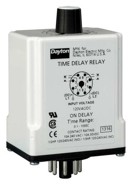 SKU G2987397CategoriesDescription Single Function Time Delay Relay, Adjustment Method Potentiometer, Base Shape Octal, Coil Voltage 120V AC/DC, Contact Form DPDT, Contact Rating (AC) 10 A @ 240V, Contact Rating (DC) 10 A @ 30V, Current Rating 10 A, Number of Delay Functions 1, Delay Function On Delay, Electrical Connection Socket, Flat Pin Width Not Applicable, IP Rating IP20, Input Voltage 240V AC, Minimum Time Setting 9 sec, Maximum Time Setting 15 min, Number of Pins 8, Sealing Enclosed, Mounting Style Plug-IngraingerSKU: 1EGB8, mscSKU: , zoro_no: G2987397, mongo_id: 65bbe83422d7a989a98e01e6