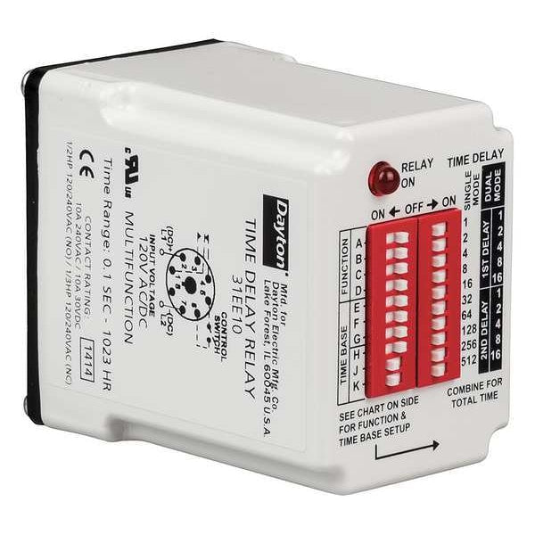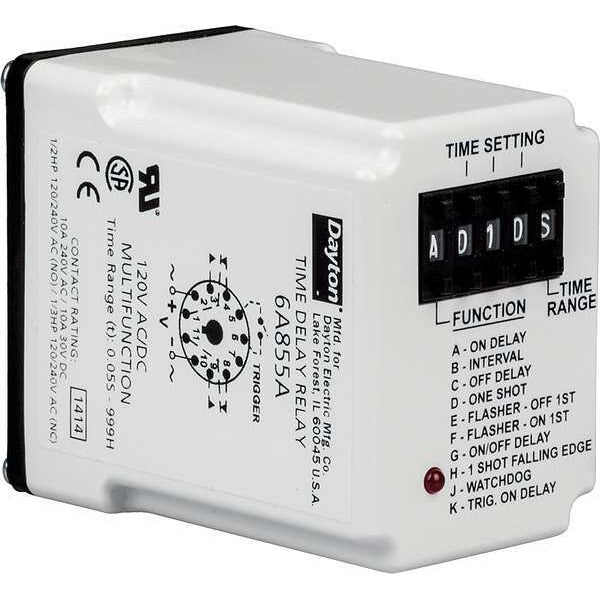 Description Multi-Function Time Delay Relay, Adjustment Method Dip Switch, Base Shape Octal, Coil Voltage 120V AC, Contact Form SPDT, Contact Rating (AC) 10 A @ 240V, Contact Rating (DC) 10 A @ 30V, Current Rating 10 A, Number of Delay Functions 16