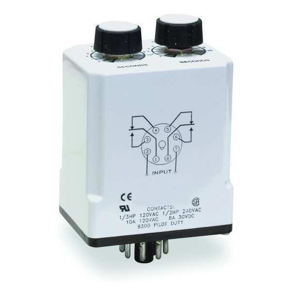 Description Single Function Time Delay Relay, Adjustment Method Potentiometer, Base Shape Octal, Coil Voltage 120V AC/DC, Contact Form DPDT, Contact Rating (AC) 10 A @ 240V, Contact Rating (DC) 10 A @ 30V, Current Rating 10 A, Number of Delay Functions 1, Delay Function Interval On, Electrical Connection Socket, Flat Pin Width Not Applicable, IP Rating IP20, Input Voltage 120V AC/DC, Minimum Time Setting 1.8 sec, Maximum Time Setting 3 min, Number of Pins 8, Sealing Enclosed, Mounting Style Plug-In