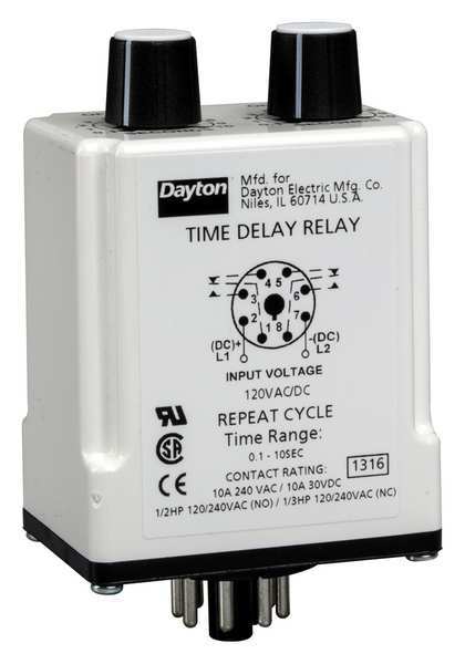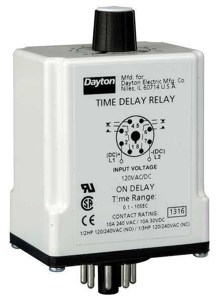 Description Time Delay Relay, Adjustment Method Potentiometer, Base Shape Octal, Coil Voltage 120V AC/DC, Contact Form DPDT, Delay Function On Delay, Electrical Connection Socket, Minimum Time Setting 0.1 sec, Maximum Time Setting 10 sec, Number of Pins 8, Mounting Style Plug-In, Compatible with Grainger Part Number 1EGP3, 1EGP5, 5X852, Contact Material Silver Nickel, Frequency 50 Hz, 60 Hz