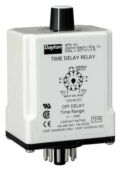 • Time Delay Relay, 120VAC/DC, 10A, DPDT, Max. Time Setting - Timer: 3 min