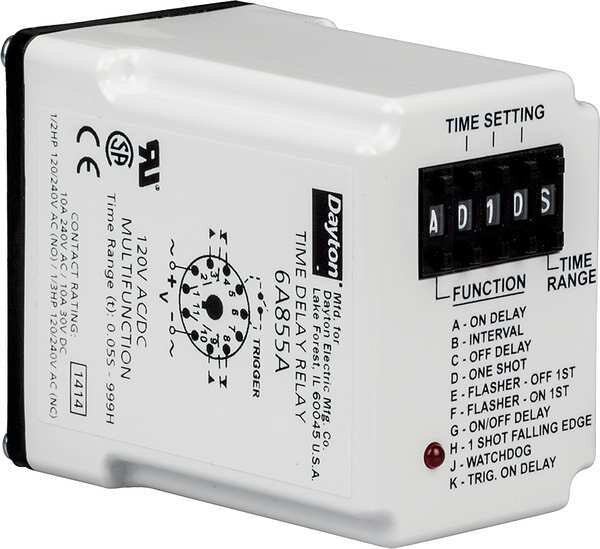 Description Multi-Function Time Delay Relay, Adjustment Method Push Button, Rotary Knob, Base Shape Octal, Coil Voltage 240V AC, Contact Form DPDT, Contact Rating (AC) 10 A @ 240V, Contact Rating (DC) 10 A @ 30V, Current Rating 10 A, Number of Delay Functions 10, Delay Function Multi Function, Electrical Connection Socket, Flat Pin Width Not Applicable, IP Rating IP20, Input Voltage 240V AC, Minimum Time Setting 0.05 sec, Maximum Time Setting 999 hr, Number of Pins 11, Sealing Enclosed