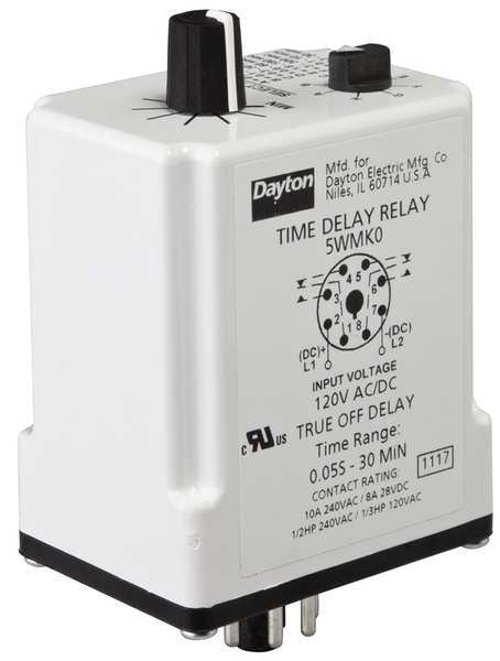 SKU G3059612CategoriesDescription Single Function Time Delay Relay, Adjustment Method Potentiometer, Base Shape Octal, Coil Voltage 120V AC/DC, Contact Form DPDT, Contact Rating (AC) 10 A @ 240V, Contact Rating (DC) 10 A @ 30V, Current Rating 10 A, Number of Delay Functions 1, Delay Function Off Delay, Electrical Connection Socket, Flat Pin Width Not Applicable, IP Rating IP20, Input Voltage 240V AC, Minimum Time Setting 3 sec, Maximum Time Setting 5 min, Number of Pins 11, Sealing Enclosed, Mounting Style Plug-IngraingerSKU: 1EGC6, mscSKU: , zoro_no: G3059612, mongo_id: 65bbe91d22d7a989a9936064