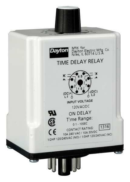 SKU G1734442CategoriesDescription Single Function Time Delay Relay, Adjustment Method Potentiometer, Base Shape Octal, Coil Voltage 120V AC/DC, Contact Form DPDT, Contact Rating (AC) 10 A @ 240V, Contact Rating (DC) 10 A @ 30V, Current Rating 10 A, Number of Delay Functions 1, Delay Function Interval On, Electrical Connection Socket, Flat Pin Width Not Applicable, IP Rating IP20, Input Voltage 120V AC/DC, Minimum Time Setting 3 sec, Maximum Time Setting 5 min, Number of Pins 8, Sealing Enclosed, Mounting Style Plug-IngraingerSKU: 1EGC9, mscSKU: , zoro_no: G1734442, mongo_id: 65bbee06526e052139ae5192