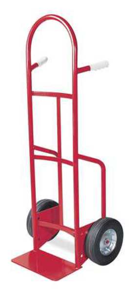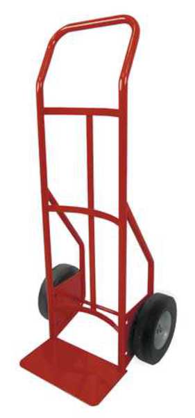 Description Standard Steel General Purpose Hand Truck, Load Capacity 800 lb, Overall Depth 20 1/2 in, Overall Height 50 1/2 in, Overall Width 20 1/2 in, Nose Plate Depth 8 in, Nose Plate Width 14 in, Nose Plate Type Solid Straight, Without Wheel Fenders, Frame Finish Powder Coated, Frame Type Rounded Back, Handle Type Continuous Frame Dual Pin, Axle-Mounted Wheel Dia. 10 in, Axle-Mounted Wheel Type Flat-Free, Includes Foot Assist Without Foot Assist, Includes Lever Pushoff Without Lever Pushoff