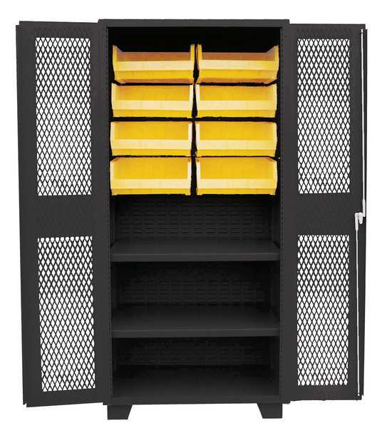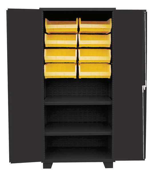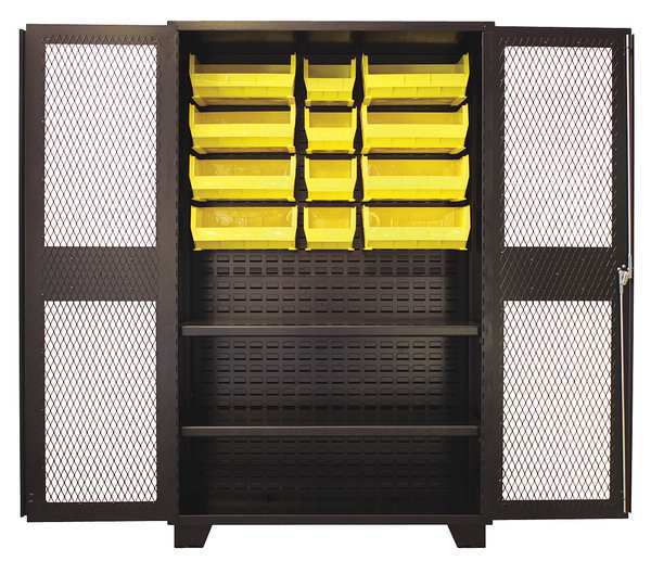 Extra-Heavy Duty Bin Cabinet, 36 in W, 78 in H, 24" D, 8 BinsSKU G9946045CategoriesDescription Bin Cabinet, Base Type Legs, Bin Color Yellow, Bin HxWxD (8) 7 in x 16 1/2 in x 14 3/4 in, Cabinet Color Black, Cabinet Storage Components Bins, Shelves, Door Type Ventilated, Frame Assembled Assembled, Mobility Stationary, Number of Bins 8, Number of Cabinet Bins 8, Number of Door Bins 0, Number of Shelves 2, Overall Depth 24 in, Overall Height 78 in, Overall Width 36 in, Vertical Shelf Clearance (2) 2 1/2 in, Bin Depth 14 3/4 in, Bin Height 7 in, Bin Louvered Panel Location Cabinet BackgraingerSKU: 18H112, mscSKU: , zoro_no: G9946045, mongo_id: 65bbe6373aaddbd5a90145e6