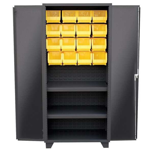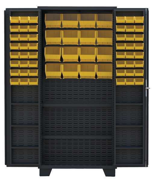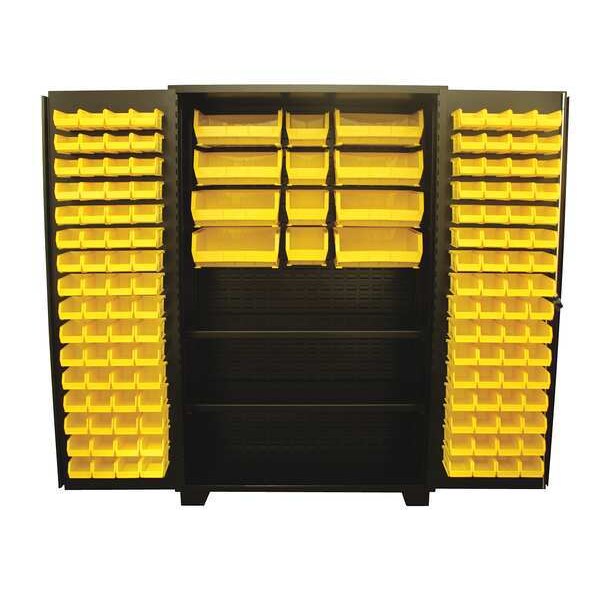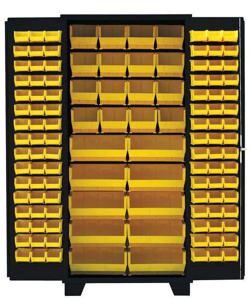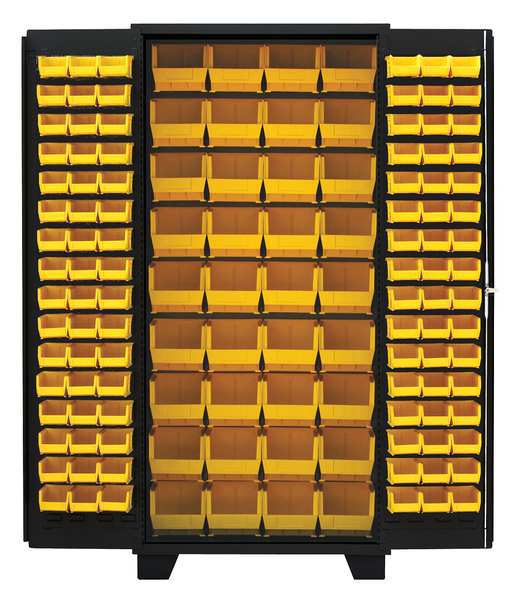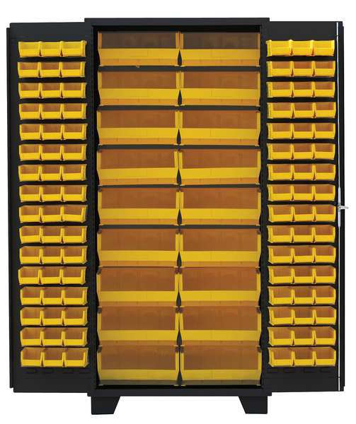 Extra-Heavy Duty Bin Cabinet, 48 in W, 78 in H, 24" D, 140 BinsSKU G9945722CategoriesDescription Bin Cabinet, Base Type Legs, Bin Color Yellow, Bin HxWxD (128) 3 in x 4 1/8 in x 7 1/2 in, (4) 7 in x 8 1/4 in x 11 in, (8) 7 in x 16 1/2 in x 14 3/4 in, Cabinet Color Black, Cabinet Storage Components Bins, Shelves, Door Type Flush, Frame Assembled Assembled, Mobility Stationary, Number of Bins 140, Number of Cabinet Bins 12, Number of Door Bins 128, Number of Shelves 2, Overall Depth 24 in, Overall Height 78 in, Overall Width 48 in, Vertical Shelf Clearance (2) 2 1/2 ingraingerSKU: 18H144, mscSKU: , zoro_no: G9945722, mongo_id: 65bbe8b222d7a989a990c595