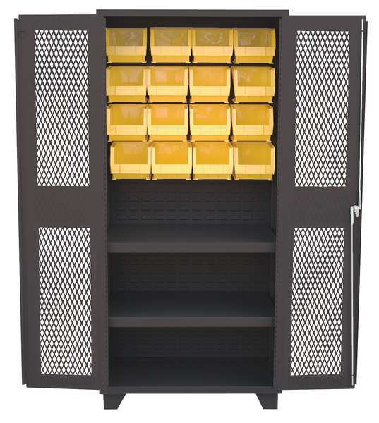 Extra-Heavy Duty Bin Cabinet, 36 in W, 78 in H, 24" D, 16 BinsSKU G9946011CategoriesDescription Bin Cabinet, Base Type Legs, Bin Color Yellow, Bin HxWxD (16) 7 in x 8 1/4 in x 11 in, Cabinet Color Black, Cabinet Storage Components Bins, Shelves, Door Type Ventilated, Frame Assembled Assembled, Mobility Stationary, Number of Bins 16, Number of Cabinet Bins 16, Number of Door Bins 0, Number of Shelves 2, Overall Depth 24 in, Overall Height 78 in, Overall Width 36 in, Vertical Shelf Clearance (2) 2 1/2 in, Bin Depth 11 in, Bin Height 7 in, Bin Louvered Panel Location Cabinet BackgraingerSKU: 18H115, mscSKU: , zoro_no: G9946011, mongo_id: 65bbe74c3aaddbd5a9086f88