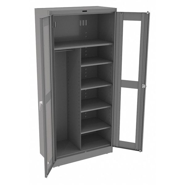 SKU G9835646CategoriesDescription Storage Cabinet, Base Type Leveling, Body Panel Type Solid, Cabinet Color Medium Gray, Cabinet Material Steel, Cabinet Storage Components Hanging Rods, Shelves, Door Handle Type Swing, Door Type Clearview, Duty Rating Medium Duty, For Use Indoors/Outdoors No, Frame Assembled Assembled, Load Capacity per Shelf 150 lb, Lock Type Keyed, Mobility Stationary, Mounting Location Freestanding, Number of Shelves 5, Overall Depth 18 in, Overall Height 78 in, Overall Width 36 in, Audit Trail Storage NonegraingerSKU: 9TZX0, mscSKU: , zoro_no: G9835646, mongo_id: 65bbe5ce3aaddbd5a9fe930e