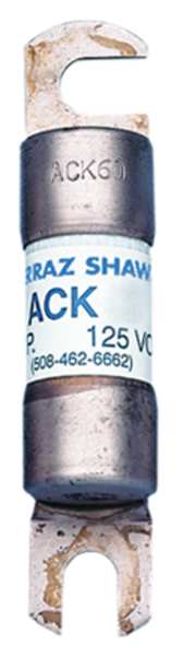 Description Forklift Limiter Fuse, 60 A, 125V AC, 125V DC, ACK Series, Nonindicating, Time Delay, Body Style Bolt-On, Nonrejection, Interrupt Rating 10kA at 125 V DC, 10kA at 125V AC, Fuse Size 3-3/4 in L x 55/64 in dia, Length 3 3/4 in, Width Not Applicable, Depth Not Applicable, Diameter 55/64 in, Equivalent Brand and Series Littelfuse CCK, Mersen ACK, Equivalent Series ACK, CCK, Body Material Poly Tube, Dual Element, Standards UL Recognized Component To Standard 248-1, File E60314 JFHR2