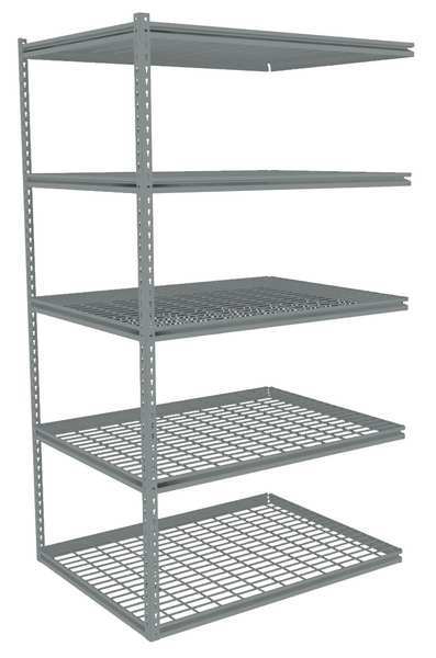$622.49 / eachWeb priceBoltless Shelving, Add-On, 60x24, WireSKU G9876501CategoriesDescription Boltless Shelving, Z-Beam, Overall Depth 24 in, Overall Height 84 in, Overall Width 60 in, Shelf Gauge 11 ga, Shelf Adjustment Increments 1 1/2 in, Steel, Steel, Steel, (2) Posts, (20) Beams, Includes Decking Yes, 750 lb, Whole Unit Load Capacity 3,750 lb, Add-On, Open, SCS Indoor Advantage(R) Certified, Post Gauge 16 ga, Number of Shelves 5, Maximum Post Load Capacity 8,000 lb with Beams Evenly Spaced at 24 in, Powder Coated, Medium-Duty, GraygraingerSKU: null, mscSKU: null, zoro_no: G9876501, mongo_id: 65bbe6f23aaddbd5a9064d12