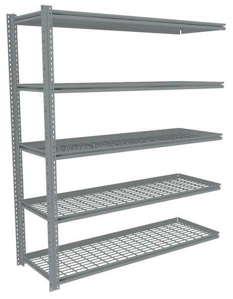 $624.99 / eachWeb priceBoltless Shelving, Add-On, 60x18, WireSKU G9876526CategoriesDescription Boltless Shelving, Z-Beam, Overall Depth 18 in, Overall Height 84 in, Overall Width 60 in, Shelf Gauge 11 ga, Shelf Adjustment Increments 1 1/2 in, Steel, Steel, Steel, (2) Posts, (20) Beams, Includes Decking Yes, 750 lb, Whole Unit Load Capacity 3,750 lb, Add-On, Open, SCS Indoor Advantage(R) Certified, Post Gauge 16 ga, Number of Shelves 5, Maximum Post Load Capacity 8,000 lb with Beams Evenly Spaced at 24 in, Powder Coated, Medium-Duty, GraygraingerSKU: 44R048, mscSKU: , zoro_no: G9876526, mongo_id: 65bbe82222d7a989a98dbdce