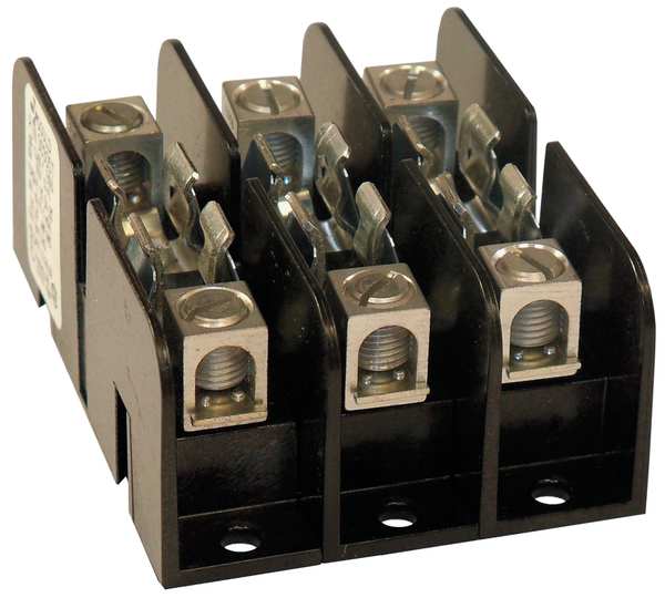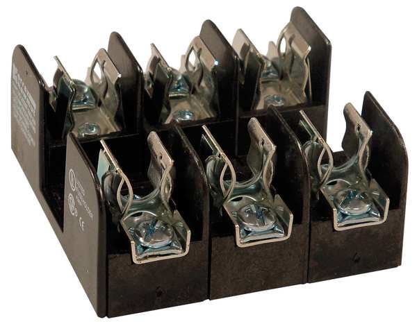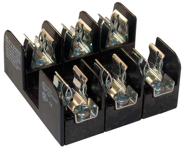 Description Fuse Block, Fits Fuse Type Industrial, Fuse UL Class H, K5, 0 to 30 A, Number of Poles 3, 600V AC/DC, For Fuse Size 5 in L x 13/16 in dia, Compatible Fuse Series NLS, NOS, OTS, RES, RFS, RLS, Series 6HKRFB, Nonindicating, Nonrejection, Fuse Block Design Open, Wire Range 14 to 4 AWG, Mounting Style Bolt-Down, Body Material Glass Filled Polycarbonate, Connector Type Box Lug (Cu), Height 2.2 in, Width 3.62 in, Length 3.91 in, Spring Reinforced Clip Yes, Standards CSA Certified, UL Listed