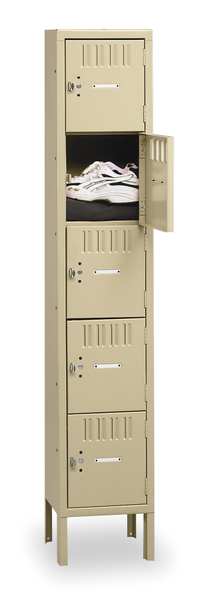 SKU G5835033CategoriesDescription Box Locker, Audit Trail Storage None, Frame Assembled Assembled, Number of Tiers 5, Number of Units Wide 1, Door Type Louvered, Frame Material Thickness 16 ga, Includes Number Plates Yes, Locker Color Tan, Lock Type Padlock Hasp, Overall Depth 15 in, Overall Height 66 in, Overall Width 12 in, Handle Type Pull, Includes ID Plate, Locker Material Steel, Number of Lockers 5, Opening Depth 13 7/8 in, Opening Height 10 5/8 in, Opening Width 9 5/8 ingraingerSKU: 5ZJ59, mscSKU: , zoro_no: G5835033, mongo_id: 65bbe80722d7a989a98d22c6