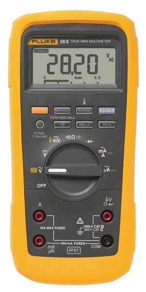 $757.49 / eachWeb priceDigital Multimeter, 1,000 Max. AC Volts, 1,000 Max. DC Volts, 10 Max. AC Amps, 10 Max. DC AmpsSKU G8359985CategoriesDescription Digital Multimeter, Audible Continuity Yes, Basic AC Voltage Accuracy +/-(1.0 Percent + 3), Basic DC Voltage Accuracy +/-0.09 Percent + 2 Digits, Data Hold Yes, Basic DC Current Accuracy +/-(1.0 Percent + 3), Instrument Safety Rating CAT III 1000V, CAT IV 600V, Maximum AC Voltage Measurement 1,000 V, Maximum DC Voltage Measurement 1,000 V, Instrument Counts 6,000, Special Features Closed Case Calibration Through Front Panel, Ergonomic Case with Integrated Protective HolstergraingerSKU: 6MR08, mscSKU: , zoro_no: G8359985, mongo_id: 65bbe7f522d7a989a98ccb6c