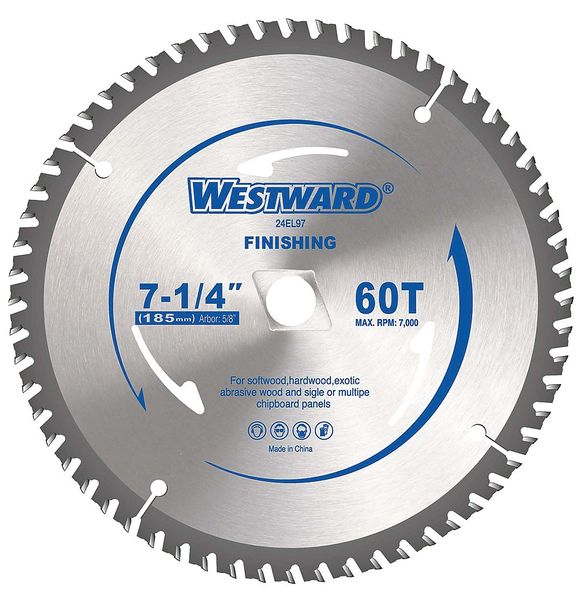 $30.31 / eachWeb price7-1/4", 60-Teeth Circular Saw BladeSKU G5775716CategoriesDescription Circular Saw Blade, Blade Dia. 7 1/4 in, Max. Blade Speed 7,000 RPM, Arbor Size 5/8 in, Arbor Shape Round, Diamond Knockout Yes, Number of Teeth 60, Max. Cutting Depth 3 1/8 in, Primary Material Application Wood, Materials Cut Wood, Wood Cutting Type Crosscutting, Cut Width 0.071 in, Tip Material Carbide Tipped, Hook Angle 15 Degrees , Tooth Grind ATB, For Use With Saw Type Circular Saws, Blade Type Crosscutting, Plate Thickness 0.047 ingraingerSKU: 24EL97, mscSKU: , zoro_no: G5775716, mongo_id: 65bbe9cb22d7a989a9979831