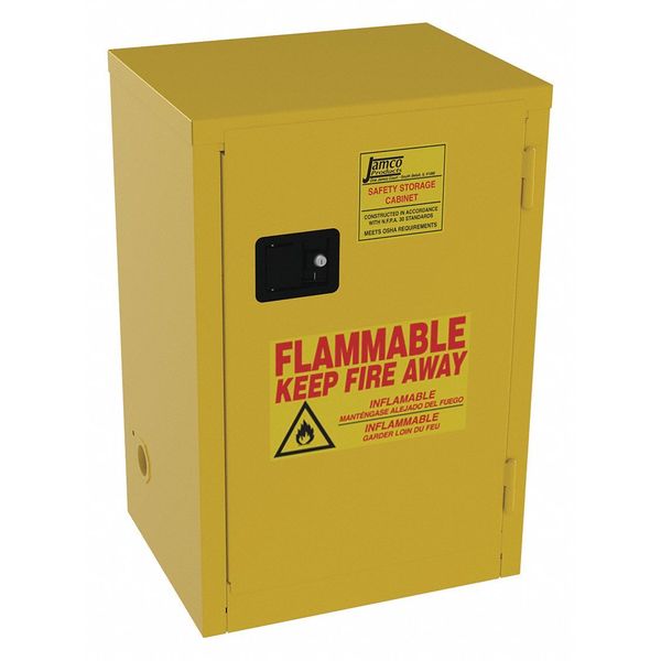Description Flammable Cabinet, Safety Cabinet Type Standard, Capacity 12 gal, Height 35 in, Width 23 in, Depth 18 in, Safety Cabinet Door Type Self-Closing, Number of Cabinet Shelves 1, Color Yellow, Number of Doors 1