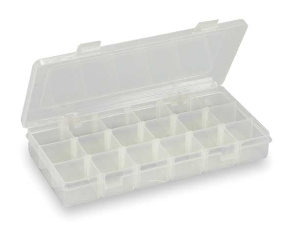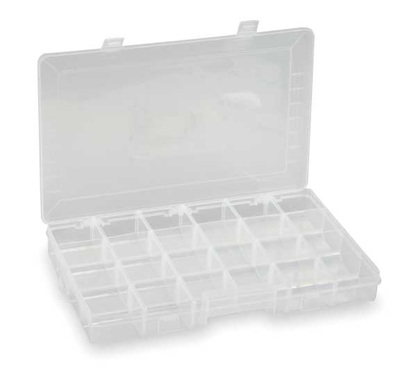 $20.99 / eachWeb priceAdjustable Compartment Box with 4 to 24 compartments, Plastic, 1 7/8 in H x 15 in WSKU G2117193CategoriesDescription Adjustable Compartment Box, Closure Type Double Latch, Color Clear, Electrostatic Discharge No, Material Plastic, Maximum Number of Compartments 24, Number of Adjustable Dividers 20, Overall Height 1 7/8 in, Overall Length 9 1/4 in, Overall Width 15 in, Includes Handle Yes, Shape RectangulargraingerSKU: 2HFR5, mscSKU: , zoro_no: G2117193, mongo_id: 65bbe5be3aaddbd5a9fe400f