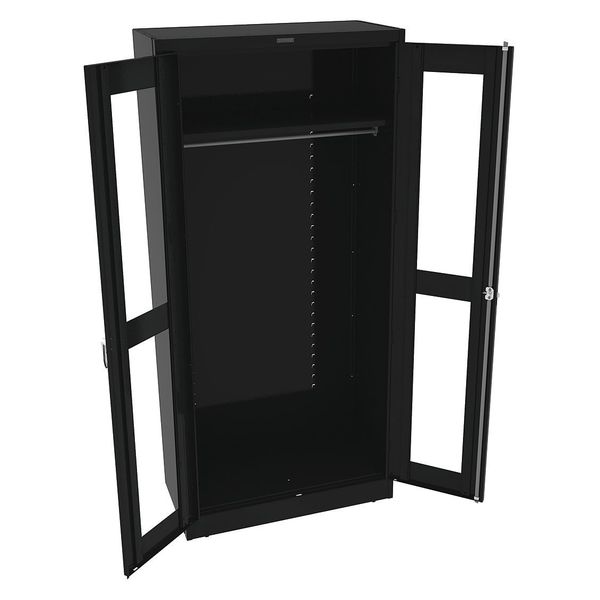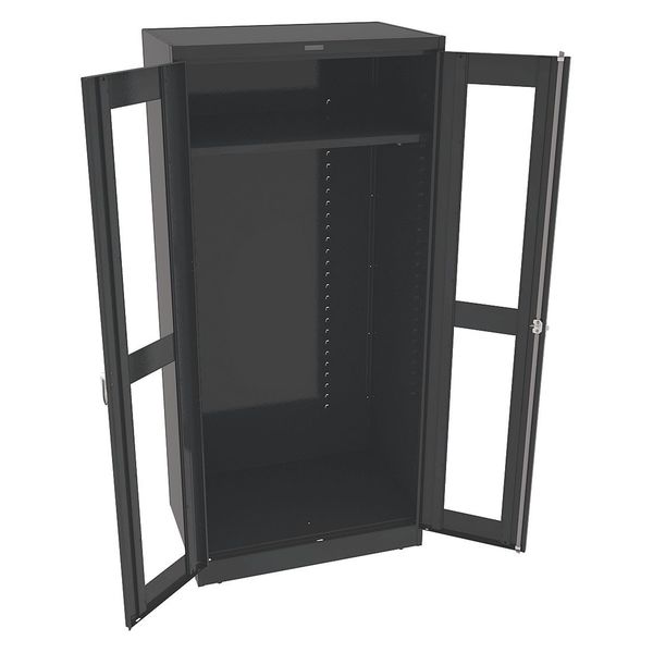 SKU G2120828CategoriesDescription Storage Cabinet, Base Type Leveling, Body Panel Type Solid, Cabinet Color Black, Cabinet Material Steel, Cabinet Storage Components Hanging Rods, Shelves, Door Handle Type Swing, Door Type Clearview, Duty Rating Medium Duty, For Use Indoors/Outdoors No, Frame Assembled Unassembled, Load Capacity per Shelf 150 lb, Lock Type Keyed, Mobility Stationary, Mounting Location Freestanding, Number of Shelves 1, Overall Depth 18 in, Overall Height 78 in, Overall Width 36 in, Audit Trail Storage NonegraingerSKU: 8E328, mscSKU: , zoro_no: G2120828, mongo_id: 65bbe9db22d7a989a997f2c7