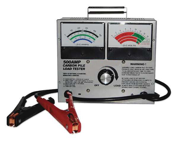 SKU G5317654CategoriesDescription Battery Tester, Analog, Load Ranges 50 to 125A, Voltage Range 0 to 16V, Works With 6V and 12V Batteries, Cold Cranking Amps 500 to 1000, Resolution Low, Accuracy +/-0.2, Display Analog, Construction Steel, Height (In.) 10 3/4 in, Width (In.) 4 in, Depth (In.) 4 1/2 in, Includes Instructions, Manufacturers Warranty Length 1 yrgraingerSKU: 22YM06, mscSKU: , zoro_no: G5317654, mongo_id: 65bbe8729a749db82279157a
