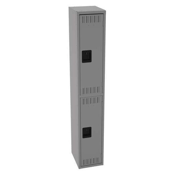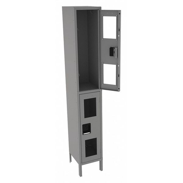 Description Wardrobe Locker, Audit Trail Storage None, Frame Assembled Assembled, Number of Tiers 2, Number of Units Wide 1, Door Type Clearview, Frame Material Thickness 16 ga, Includes Number Plates Yes, Locker Color Gray, Lock Type Padlock Hasp, Overall Depth 15 in, Overall Height 78 in, Overall Width 12 in, Handle Type Recessed Lift, Includes ID Plate, Locker Finish Powder Coated, Locker Material Steel, Number of Lockers 2, Opening Depth 13 7/8 in, Opening Height 34 1/4 in, Opening Width 9 5/8 in