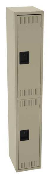 Description Wardrobe Locker, Audit Trail Storage None, Frame Assembled Assembled, Number of Tiers 2, Number of Units Wide 1, Door Type Louvered, Frame Material Thickness 16 ga, Includes Number Plates Yes, Locker Color Tan, Lock Type Padlock Hasp, Overall Depth 15 in, Overall Height 72 in, Overall Width 12 in, Handle Type Recessed Lift, Locker Finish Powder Coated, Locker Material Steel, Number of Lockers 2, Opening Depth 13 7/8 in, Opening Height 34 1/4 in, Opening Width 9 5/8 in