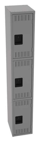 Description Wardrobe Locker, Audit Trail Storage None, Frame Assembled Assembled, Number of Tiers 3, Number of Units Wide 1, Door Type Louvered, Frame Material Thickness 16 ga, Includes Number Plates Yes, Locker Color Medium Gray, Lock Type Padlock Hasp, Overall Depth 15 in, Overall Height 72 in, Overall Width 12 in, Handle Type Recessed Lift, Locker Finish Powder Coated, Locker Material Steel, Number of Lockers 3, Opening Depth 13 7/8 in, Opening Height 22 1/4 in, Opening Width 9 5/8 in
