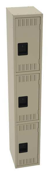 Description Wardrobe Locker, Audit Trail Storage None, Frame Assembled Assembled, Number of Tiers 3, Number of Units Wide 1, Door Type Louvered, Frame Material Thickness 16 ga, Includes Number Plates Yes, Locker Color Tan, Lock Type Padlock Hasp, Overall Depth 15 in, Overall Height 72 in, Overall Width 12 in, Handle Type Recessed Lift, Locker Finish Powder Coated, Locker Material Steel, Number of Lockers 3, Opening Depth 13 7/8 in, Opening Height 22 1/4 in, Opening Width 9 5/8 in