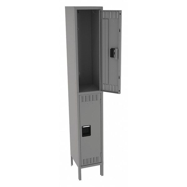 Description Wardrobe Locker, Audit Trail Storage None, Frame Assembled Assembled, Number of Tiers 2, Number of Units Wide 1, Door Type Louvered, Frame Material Thickness 16 ga, Includes Number Plates Yes, Locker Color Medium Gray, Lock Type Padlock Hasp, Overall Depth 15 in, Overall Height 72 in, Overall Width 12 in, Handle Type Recessed Lift, Locker Finish Powder Coated, Locker Material Steel, Number of Lockers 2, Opening Depth 13 7/8 in, Opening Height 34 1/4 in, Opening Width 9 5/8 in