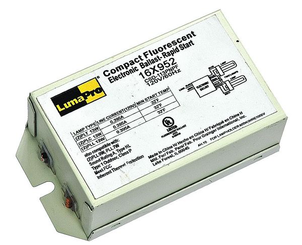 Description LumaPro(R), Electronic, CFL Ballast, Ballast Start Type Programmed, Input Voltage 120 to 277V AC, Number of Bulbs Supported 1, 2, Max. Bulb Watts 13 W, Compact Fluorescent Ballast Bulb Type, Dimming No, Dimming Type No Dimming, Dimming Method No Dimming, Dimming Range No Dimming, 0 Degrees F Min. Starting Temp., 50 Degrees F Max. Operating Temp., Thermal Protection No