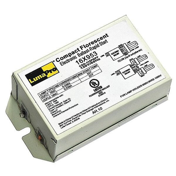 Description LumaPro(R), Electronic, CFL Ballast, Ballast Start Type Rapid, Input Voltage 120V AC, Number of Bulbs Supported 1, 2, Max. Bulb Watts 18 W, Compact Fluorescent Ballast Bulb Type, Dimming No, Dimming Type No Dimming, Dimming Method No Dimming, Dimming Range No Dimming, CA Title 20 Compliant No, 32 Degrees F Min. Starting Temp., 194 Degrees F Max. Operating Temp., Thermal Protection Class P