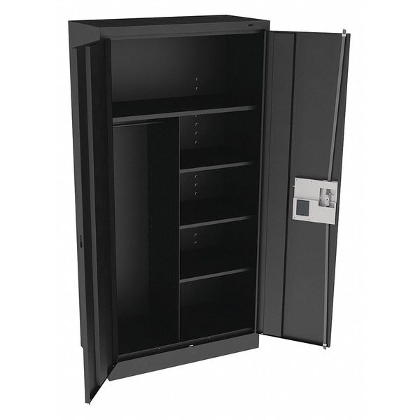 SKU G2176408Categories Raw MaterialsDescription Storage Cabinet, Base Type Frame, Body Panel Type Solid, Cabinet Color Black, Cabinet Material Steel, Cabinet Storage Components Hanging Rods, Shelves, Door Handle Type Recessed Pull, Door Type Solid, Duty Rating Light Duty, For Use Indoors/Outdoors No, Frame Assembled Assembled, Load Capacity per Shelf 150 lb, Lock Type Electronic Keypad, Mobility Stationary, Mounting Location Freestanding, Number of Shelves 5, Overall Depth 18 in, Overall Height 72 in, Overall Width 36 ingraingerSKU: 39FR23, mscSKU: , zoro_no: G2176408, mongo_id: 65bbe5893aaddbd5a9fcc727