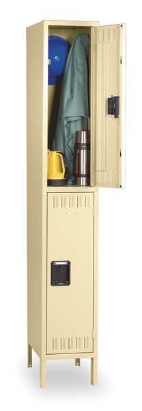 SKU G5459167CategoriesDescription Wardrobe Locker, Audit Trail Storage None, Frame Assembled Unassembled, Number of Tiers 2, Number of Units Wide 1, Door Type Louvered, Frame Material Thickness 16 ga, Includes Number Plates Yes, Locker Color Tan, Lock Type Padlock Hasp, Overall Depth 18 in, Overall Height 78 in, Overall Width 15 in, Handle Type Recessed Lift, Includes Coat Hooks and ID Plate, Locker Finish Powder Coated, Locker Material Steel, Number of Lockers 2, Opening Depth 16 7/8 in, Opening Height 34 1/4 ingraingerSKU: 1RZW9, mscSKU: , zoro_no: G5459167, mongo_id: 65bbe78f9a749db8227433db