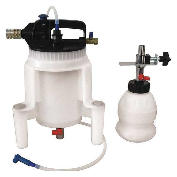 Description Brake Bleeder, Tool Type Vacuum, Application Removal of Brake Fluid in Brake Systems, Number of Pieces 7, Material PE Plastic, Includes (4) Plastic Tanks, 3 Liter Air Vacuum Container, Brake Bleeder, Fitting, Hose, Vacuum, For Use With Shop Air Compressors