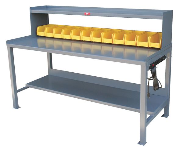 Heavy Duty Fixed Work Bench, Steel, 72" W, 34" Height, 3000 lb., StraightSKU G9830572CategoriesDescription Workbench with Riser, Height Adjustability Fixed Height, Top Material Steel, Assembly Fully Assembled, Color Gray, Frame Material Steel, Leg Type Straight Leg, Maximum Adjustable Height Not Applicable, Minimum Adjustable Height Not Applicable, Non-Metal Top Thickness Not Applicable, Number of Cabinets 0, Number of Drawers 0, Number of Knockouts 0, Included Components Lower Shelf, Power Strip, Side Stops, Storage Bins, Upper Shelf, Number of Outlets 6, Number of Shelves 3, Overall Depth 30 ingraingerSKU: null, mscSKU: null, zoro_no: G9830572, mongo_id: 65bbe5e13aaddbd5a9ff28f4