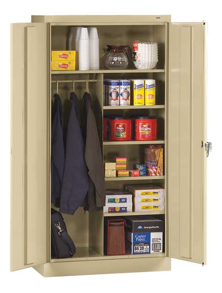 SKU G2170799Categories Raw MaterialsDescription Storage Cabinet, Base Type Frame, Body Panel Type Solid, Cabinet Color Putty, Cabinet Material Steel, Cabinet Storage Components Hanging Rods, Shelves, Door Handle Type Swing, Door Type Solid, Duty Rating Light Duty, For Use Indoors/Outdoors No, Frame Assembled Assembled, Load Capacity per Shelf 150 lb, Lock Type Keyed, Mobility Stationary, Mounting Location Freestanding, Number of Shelves 5, Overall Depth 18 in, Overall Height 72 in, Overall Width 36 in, Audit Trail Storage NonegraingerSKU: 3HNN8, mscSKU: , zoro_no: G2170799, mongo_id: 65bbe7713aaddbd5a9095433