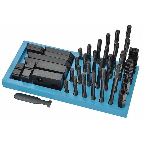$184.99 / eachWeb priceClamping Kit, 9/16, 3/8-16 Stud, 54 pcsSKU G6167944CategoriesDescription Clamping Kit, T-Slot, Number of Pieces 52, Slot Size 9/16 in, For Use With Drilling Machines, Lathes, Milling Machines, Includes (6) Step Blocks, Material - Machining Steel, Application For Fixing Each Kind of Working Piece on Machining Table, Features All the Blocks, Bolts, Nuts and Hold-Downs are Case Hardened. Racks Can Be Bolted to the Wall or Side of Machine for Easy Access, Finish - Machining Black OxidegraingerSKU: null, mscSKU: null, zoro_no: G6167944, mongo_id: 65bbe6513aaddbd5a9020177