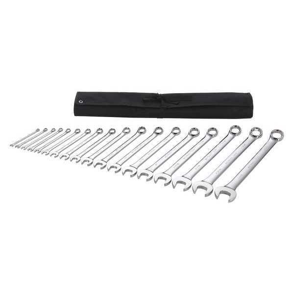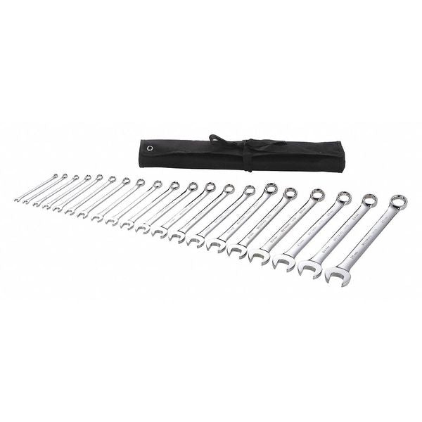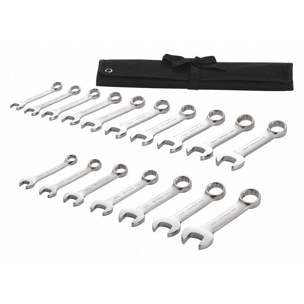 $97.19 / eachWeb priceCombination Wrench Set, 17 Pieces, 12 PtsSKU G2616789CategoriesDescription Combination Wrench Set, Alloy Steel, Satin, Number of Tools 17, Range of Head Sizes 10 mm to 19 mm, 3/8 in to 3/4 in, Head Offset Angle 15 Degrees , Offset, Pouch, SAE/Metric, 3/8 in, 10 mm, 11 mm, 7/16 in, 12 mm, 1/2 in, 13 mm, 14 mm, 9/16 in, 15 mm, 5/8 in, 16 mm, 17 mm, 11/16 in, 18 mm, 19 mm, 3/4 in, Rounded, Opening Angle (Deg.) 15 DegreesgraingerSKU: 54DG05, mscSKU: , zoro_no: G2616789, mongo_id: 65bbe8d822d7a989a991b19e