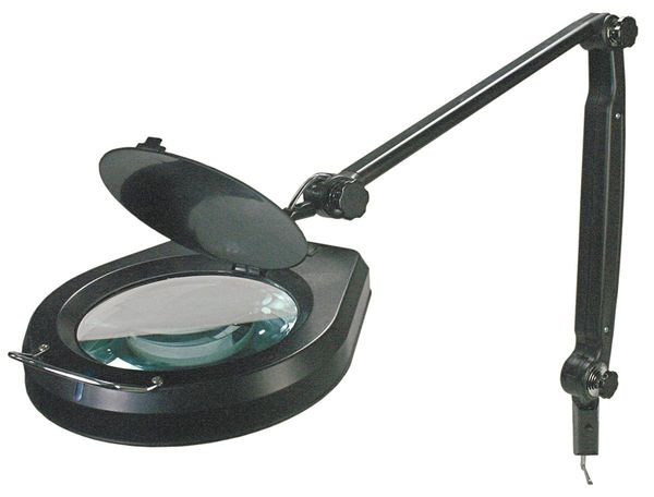 Description Round Magnifier Light, Arm Design Articulating, Arm Reach 16 in, Color Black, Diopter 3, Lens Diameter 7 in, Lens Shape Round, Lighting Technology LED, Magnification 1.75x, Maximum Brightness 767 lm, Mount Type Clamp, Operating Voltage 120 to 240V AC, Includes Ultraviolet Light No, Dimmable No, ESD Safe Yes, Features Internal Spring Arm