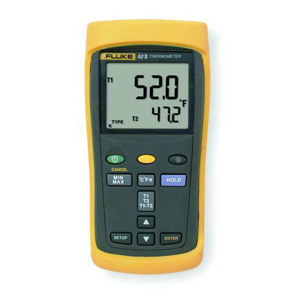 $1,211.24 / eachWeb priceFluke-52-2 NIST Thermocouple ThermometerSKU G8136834CategoriesDescription Thermocouple Thermometer, Thermocouple, Includes NIST-Traceable Certificate Yes, Accuracy +/-0.05 Percent + 0.3 Degrees C, -150 Degrees to 1,000 Degrees C (Type E), -200 Degrees to 1,300 Degrees C (Type N), -200 Degrees to 1,372 Degrees C (Type K), -210 Degrees to 1,200 Degrees C (Type J), -250 Degrees to 400 Degrees C (Type T), 0 Degrees to 1,767 Degrees C (Type R, S), (3) AA, Backlit LCD, Functions Max/Min/Avg RecordgraingerSKU: 4YV89, mscSKU: , zoro_no: G8136834, mongo_id: 65bbe8ef22d7a989a992510c