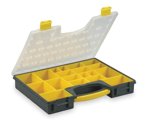 SKU G2760624CategoriesDescription Compartment Box, Color Black/Yellow, Electrostatic Discharge No, Material Plastic, Maximum Number of Compartments 19, Number of Adjustable Dividers 8, Overall Height 2 1/2 in, Overall Length 13 1/4 in, Overall Width 16 1/2 in, Includes Handle Yes, Shape RectangulargraingerSKU: 2HFT1, mscSKU: , zoro_no: G2760624, mongo_id: 65bbea6b22d7a989a99b362d