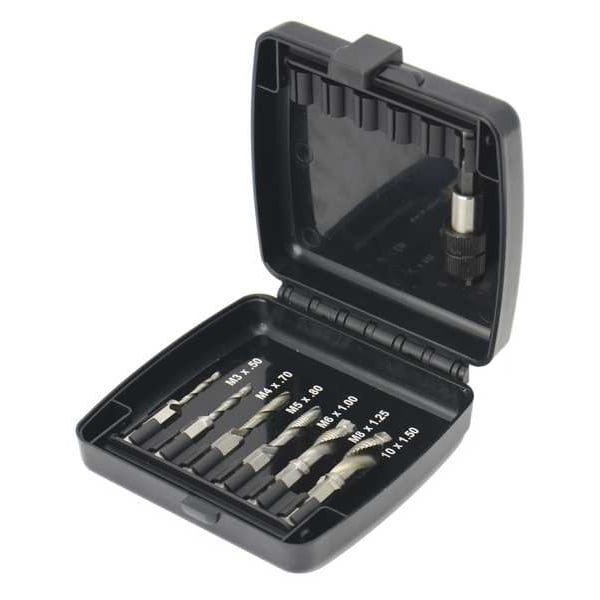 SKU G3356771CategoriesDescription Drill/Tap/Countersink Set, Number of Pieces 6, High Speed Steel, Bright (Uncoated), Thread Sizes Included M10x1.5, M3x0.5, M4x0.7, M5x0.8, M6x1, M8x1.25, Thread Standard Metric, Thread Direction Right HandgraingerSKU: 6EXL2, mscSKU: , zoro_no: G3356771, mongo_id: 65bbe69f3aaddbd5a90400a9